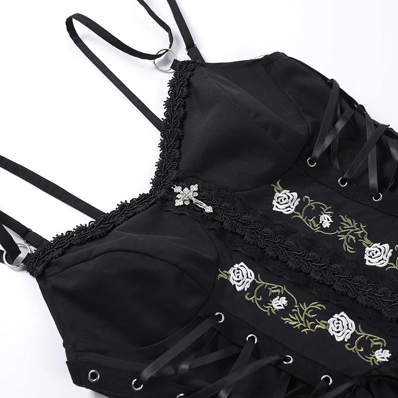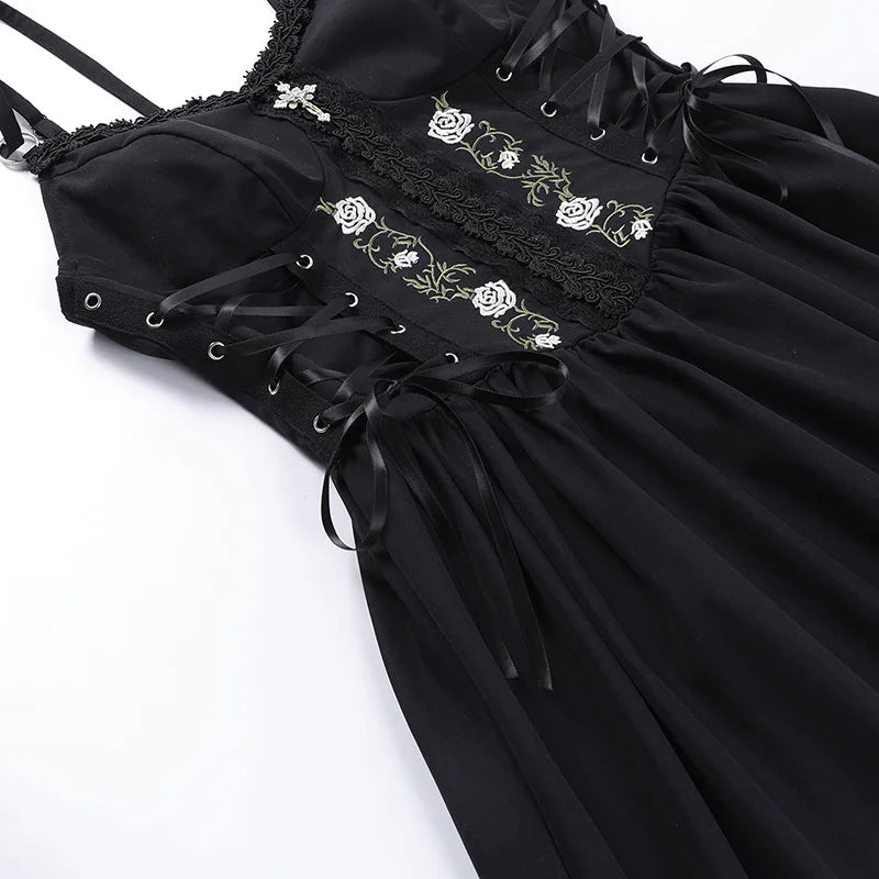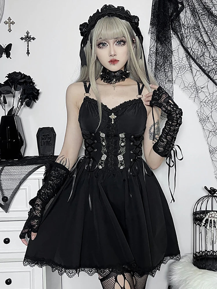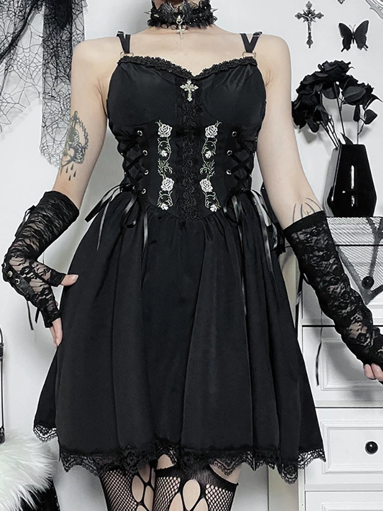 Goth Dark Lolita Gothic Aesthetic Bandage Corset Dresses Grunge Style Black Embroidery Emo Dress Women A-line Party Alt Clothes